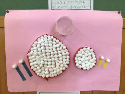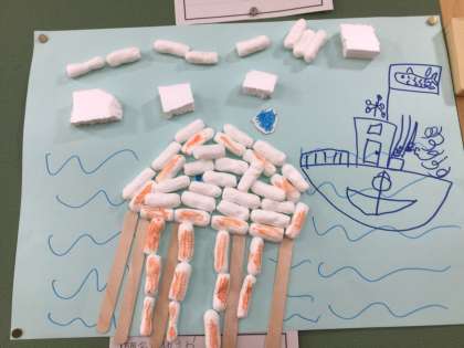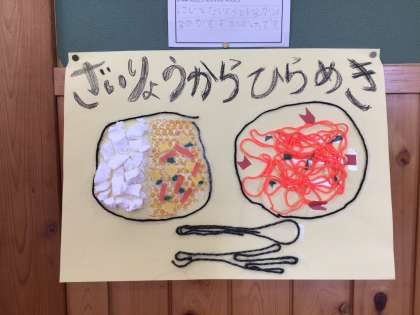 1年生教室前に掲示してある作品です。毛糸、梱包材などの素材からひらめいた作品です。カレーライス、スパゲッティ、太鼓、くらげ。一番上の写真のカレーライスとスパゲッティは先生の作品です。