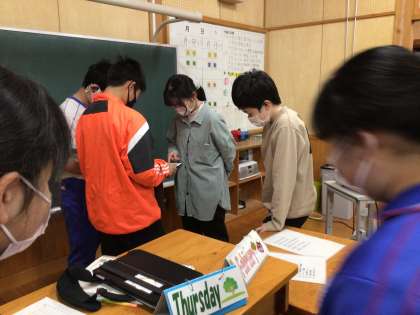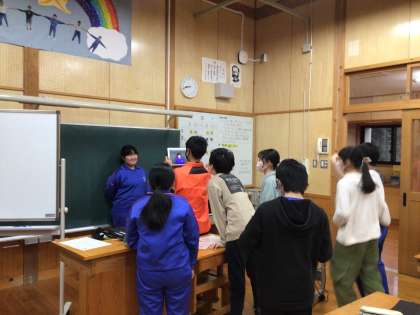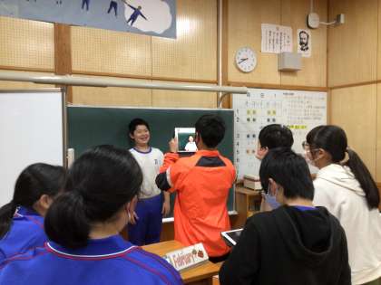 6年生は和やかな雰囲気で写真を撮っていました。卒業アルバムに使う写真です。写真を撮ってもらう子が順番に黒板の前に立ってタブレットで撮りました。撮った後は「この写真がいいね、やっぱりこっちかな」とベストショットを選んでいました。みんな、笑顔がいいですね。