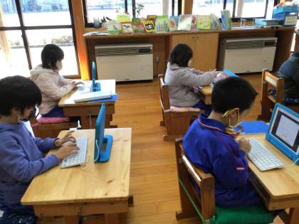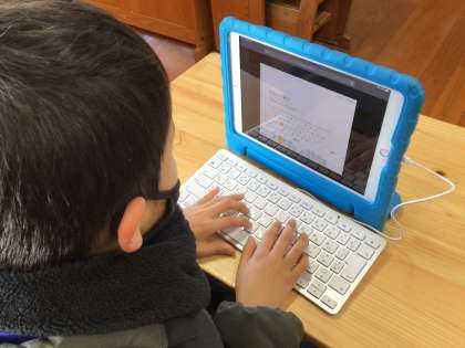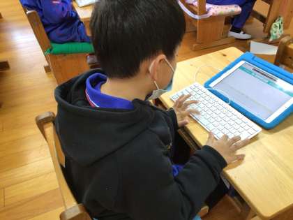 1年生の朝の学習の様子です。タブレットに付属のキーボードをつないでローマ字で入力をしています。こんなこともできるようになりました。もちろん先生の地道な指導があってのことです。入学後、子どもたちはタブレットを使う約束事やパスワードの入力や扱い、写真を撮ること、スカイメニューで学習資料を閲覧したり提出したりすることなど、一つ一つ教えてもらいました。この1年でいろんなことができるようになりました。