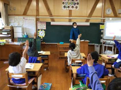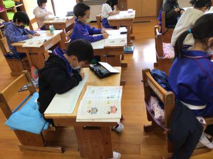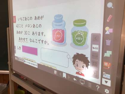 1年生の算数の授業です。「いちごのあめが40個、メロンのあめが30個、合わせて何個ですか」を考えます。まず、子どもたちが手をあげて考えを発表しました。「あわせて、だから、足し算を使えばいいと思います」先生はなかなか答えを言いません。ノートを出して早く考えたい子どもたち。前のめりな算数の授業です。
