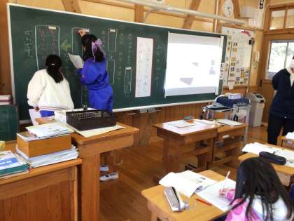 どうしてでしょう?そういえばじっくり考えたことはなかったです。これは2年生の国語の授業です。スクリーンに映されているのは国語の教科書(デジタル教科書)です。先生のタブレットから映すことができて便利です。
