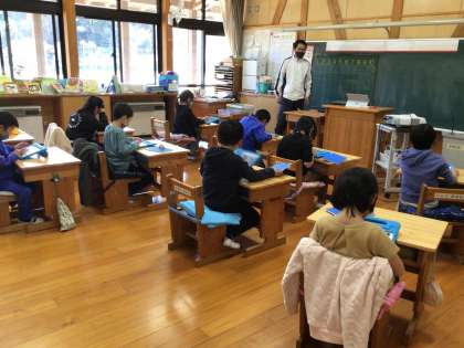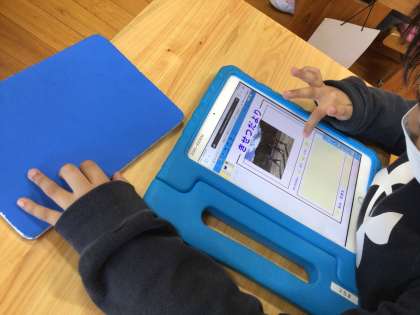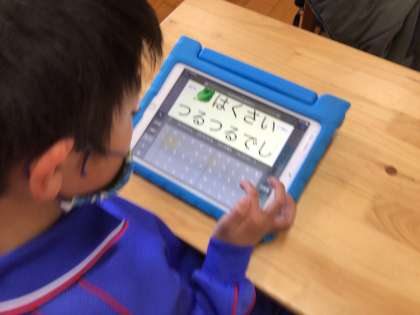 1年生教室です。子どもたちは画面をスクロールしてさっき撮った写真から1枚選び、そのままタブレットで写真を貼り付けて文字入力作業に取り掛かりました。もうすっかり慣れた作業です。