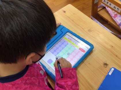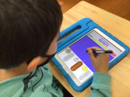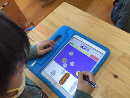 という1年生算数の単元です。タブレットのソフトを使って学習していました。1円、5円、10円などを組み合わせて画面に示された金額ピッタリにします。タブレットが「せいかい!」「足りない」と言ってくれます。