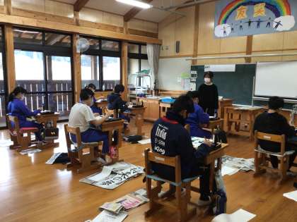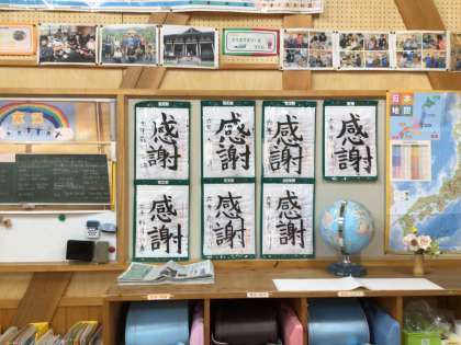 写真を撮る時のタブレットの「カシャッ」という音に気を使うほど、子どもたちは集中して半紙に向かっていました。教室の後ろには先生が朱を入れた「感謝」という文字が掲示してありました。