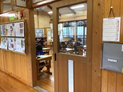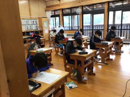 5年生は理科の確認テスト中。邪魔をしないようにそっと。