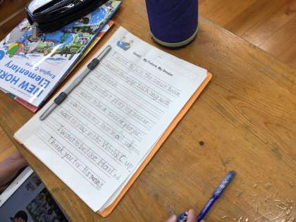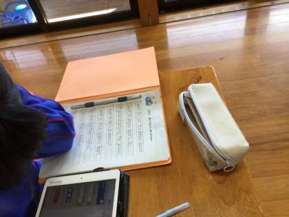 子どもたちは、それぞれ自分が書いた内容を英語で来週発表するそうです。その時にはタブレットの画面をホワイトボードに映しながら発表するそうで、内容に合う写真やイラストをタブレットで検索して選んでいました。