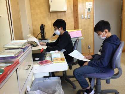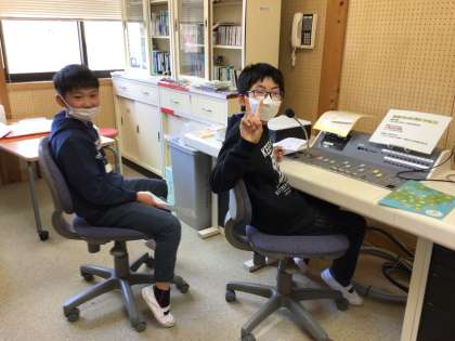 放送室では放送委員の子たちがお昼の放送中です。献立メモ、クイズ、音楽など、委員会で分担して毎日欠かさずに放送してくれます。