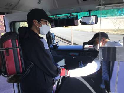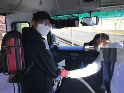 スクールバスを一番最後に降りてくるのは6年生の班長です。忘れ物がないか確認し、シートベルトを整えながら降りてくる班長さん。バスの運転手さんが毎朝「ありがとな、ごくろうさん」と声をかけてくださいます。毎朝のグータッチ。朝のバスに乗るのもあと2日になりました。ありがとうございます。
