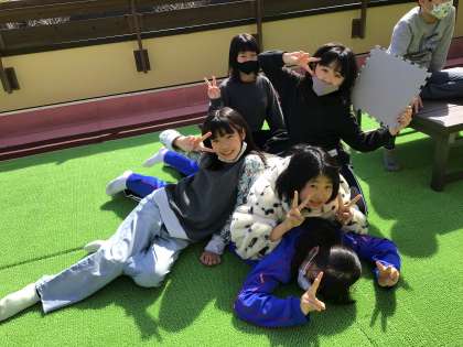 昼休み、今日も芝生スペースは大人気です。日差しが少し暑く感じるぐらい良い天気です。図書室からそのまま出られますので、本を借りた子がテラスに寄って過ごすことも多いようです。気持ちの良い風が吹いてきます。子どもたちは時計を見て名残惜しそうに教室に戻っていきました。さあ、5時間目の授業もがんばりましょう。