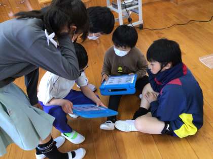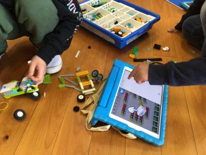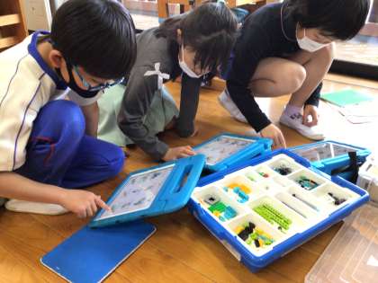 3年生がプログラミングの学習に取り組んでいます。昨年度の予算で購入した教材を使用しています。ブロックの車体、タイヤ、モーターを組み立ててプログラミングソフトから指示を出して車を動かします。