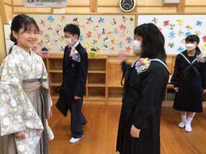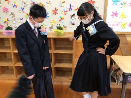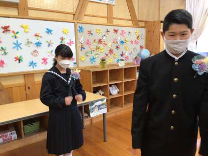 中学校の真新しい制服。ズボンが緩いとか男子諸君が話していました。すぐにズボン丈が短くなりますよ。セーラー服もとてもよく似合っています。中学校の制服に身を包んでこの教室に入るのは最初で最後です。