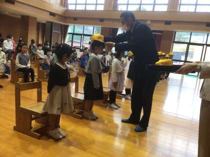 入学式が行われました。1年生の子たちは緊張しながらも、しっかりと返事をしたり、お話を聞くことができました。みんなとても立派です。