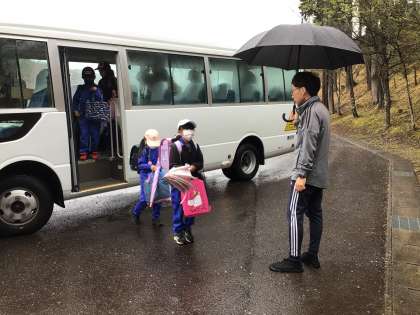子どもたちが元気に登校しました。1年生の様子を見守る上級生、頼もしいです。スクールバスの運転手さん、ありがとうございます。これからもよろしくお願いします。