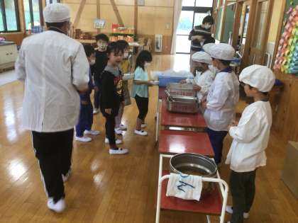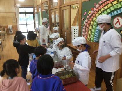 1年生の給食準備は最初のうちは6年生の子が手伝いに来てくれます。6年生も責任をもって手伝ってくれますので準備がとてもスムーズです。