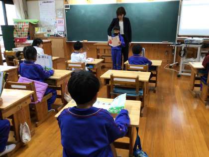 国語の教科書を元気に音読しました。教室の中を思い思いに動いて、体いっぱいに表現しました。