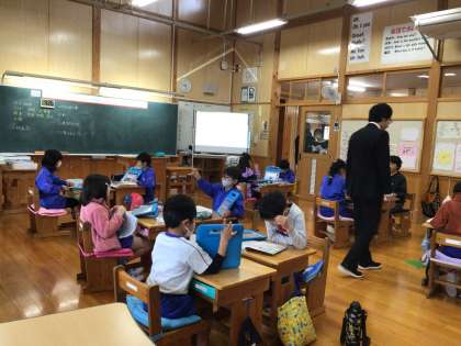 4年生の社会科です。都道府県のスリーヒントクイズを考えて解き合いました。特産品や土地の形など、工夫されたクイズが作られ、みんながんばって解いていました。クラスが大いに盛り上がりました。