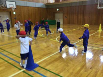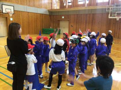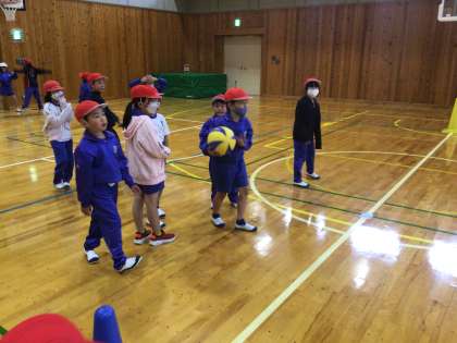授業参観後の学級懇談会の裏では全校体育が行われました。体育館いっぱいに広がってみんなで楽しくドッジボールに取り組みました。