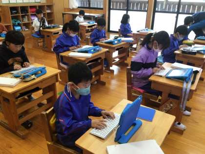 4年生は1分間でタブレットに何文字入力できるかに取り組んでいました。5年生は落ち着いた雰囲気で朝の会が行われています。立派です。