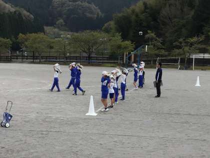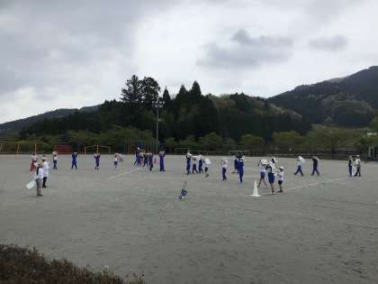 「横そろえてね」「はぁい」6年生がリーダーとして引っ張っています。この時間は、4・5・6年生が一緒に運動会練習をしています。