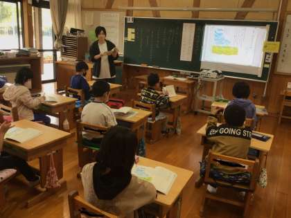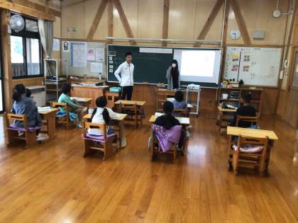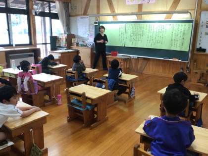 1年生はひらがなのお勉強です。リズム良くみんなで読み上げていきます。2年生はお話を読んで感想を発表しています。3年生はALTの先生の授業です。どの学年も楽しそうに授業に取り組んでいました。