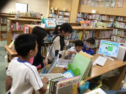 巴ヶ丘小学校の朝の図書室は子どもたちでいっぱいです。本を借りたり返したり、教室から図書室まで嬉しそうに行き来する子どもたちの様子が見られます。運動場では暑さ対策としてWBGT測定器も出されました。