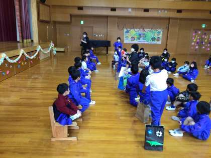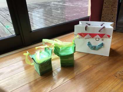 1年生に手づくりプレゼントをあげました。カッポンです。こうやって遊びます。はい、どうぞ。ありがとう。
