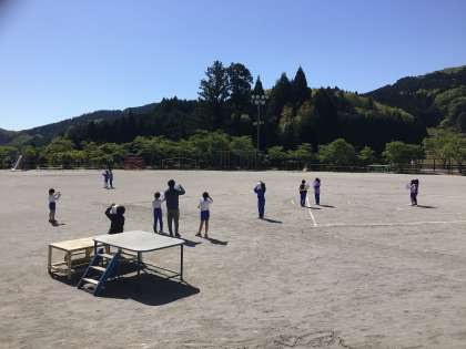 気持ちの良い晴天です。運動場では4年生が温度計を使って気温を測定しています。理科の授業のようです。