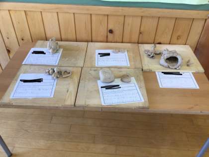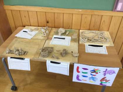 2年生の教室の外に図工の作品の粘土が飾れていました。どの作品も楽しい作品になっています。