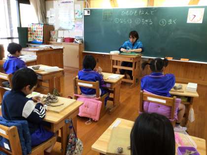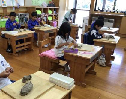1年生の図工「ひもひもねんど」です。粘土をひものような形にして、並べ、ちぎり、巻いて作ります。「オートバイができた」「こびとさんだよ」と思い思いに作っていました。