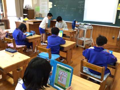 2年生の算数です。解いた問題を先生に丁寧にみてもらったり、タブレットを使って自分のペースで問題を解いたりして、一人ひとりのペースに合わせて学習が進んでいました。
