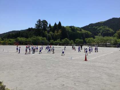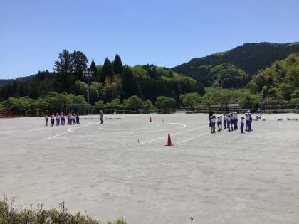 五月晴れのいい天気です。4・5・6年生が帽子とりの練習をしています。