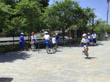 運動場を見てみると、元気な笑顔がいっぱい。運動会が近いので、一輪車に乗っている子が多いです。