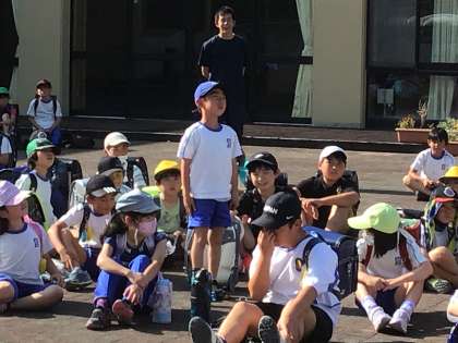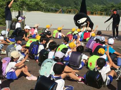 下校の会で、あいさつ運動の一環としてグランパス君にきてもらいました。あいさつはどうして大切だと思う?という質問にはきはきと答えていました。