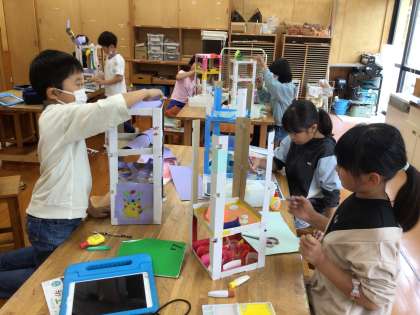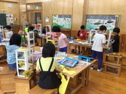 4年生の図工ではコロコロガーレに取り組んでいます。ビー玉がうまく転がるようにコースを作っていきます。みんな、おもいおもいに自分の世界を広げています。