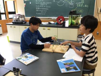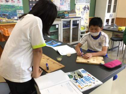 5年生の理科の学習です。植物はデンプンを作り出すのか、ヨウ素液を使って調べました。