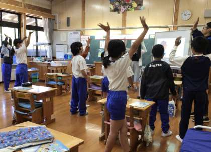4年生の外国語活動です。天気の言い方をジャスチャーを交えて練習しました。楽しい雰囲気で学んでいます。
