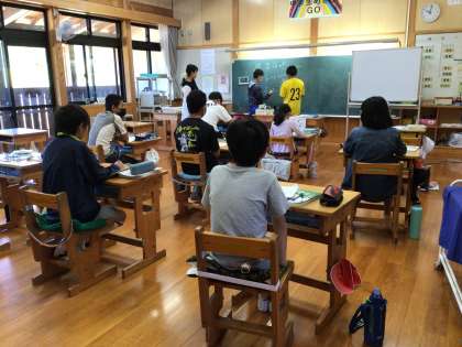 6年生の算数です。分数のわり算、かけ算の問題を黒板に書いて解きました。