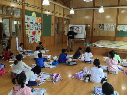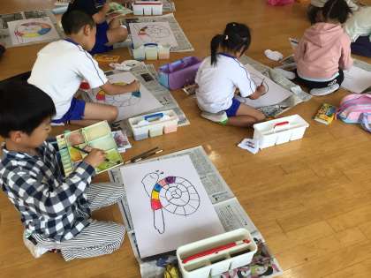 1、2年生が合同で図工に取り組んでいます。カタツムリを描いてその中に赤、青、黄色で色をぬっていきます。3色なのにまぜるとたくさん色ができることに子どもたちは興味津々です。