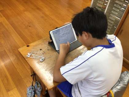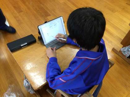 ともえ学級では、タブレットのキュビナという学習ドリルの問題を解いていました。