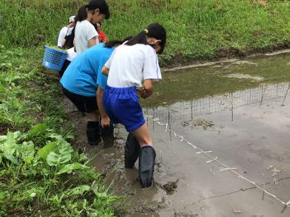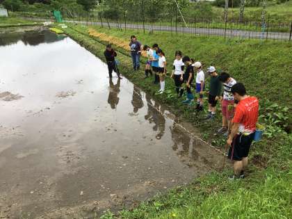 長靴や靴下で田んぼに入りました。ズブズブズブ。「うわあ、足がめり込んで行く」「足の裏の感触が」