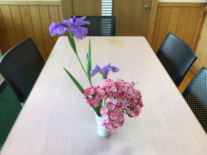 花瓶のお花は、アメリカシャクナゲとアヤメです。かわいい野花もあげていました。