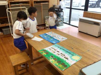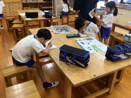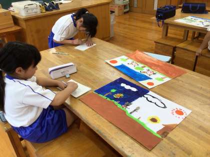 3年生の図工です。拾ってきた葉っぱや小枝をもとにした作品が出来上がってきたようです。作品の題名や説明を書いています。