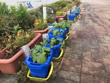 1年生が、アサガオを育てています。日光を浴びて本葉が美しい緑に輝いています。早く大きくなあれ。どんな花を咲かせるのか、子どもたちが楽しみにしています。