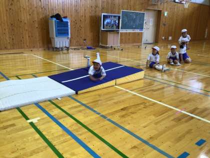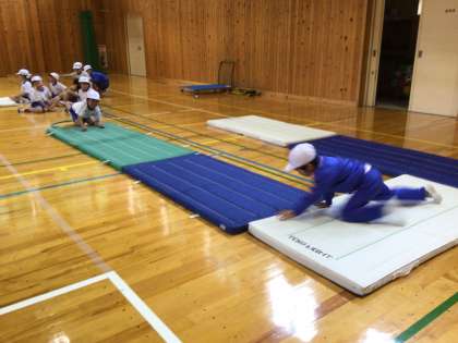 1・2年生の体育です。向かった先は屋内運動場。マット運動の学習です。ゴツゴツ、グルグル、くぐるなど、多様な動きをバランスよく行います。