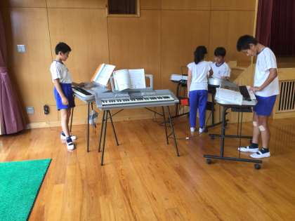 5・6年生の音楽です。音楽室の前にある多目的室で、楽器の練習をしていました。曲は「ラバーズコンチェルト」です。一人ひとりに楽器があり、思う存分練習できます。少人数ならではの活動です。みんなで合わせるのが楽しみです。