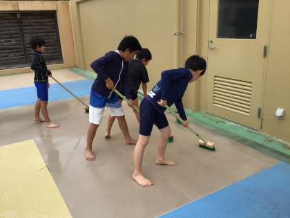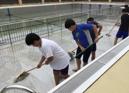 プールの底をモップがけしたり、プールサイドをブラシで磨いたり。