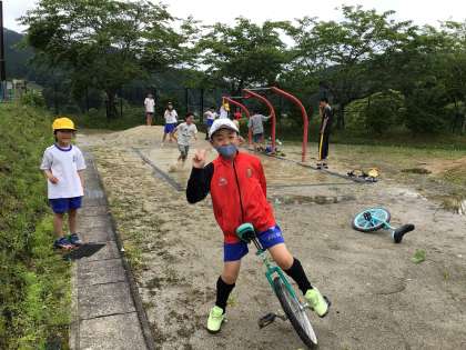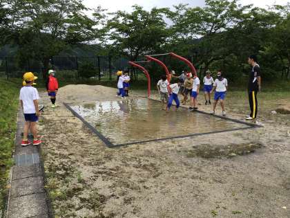 砂場の方へ行ってみると、水が池のようにたまっていました。「冷たいかな?」触って確かめたくなるのが子ども心。ちょっとだけ、のつもりが… 風邪ひかないようにね。
