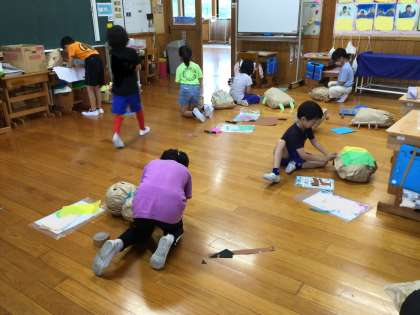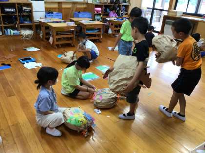 2年生が紙を丸めたり貼ったりして作品を作りました。題して、ぎゅっとできる友達を作ろうです。