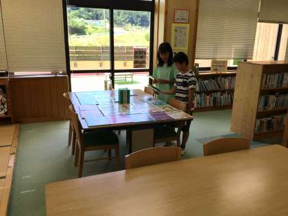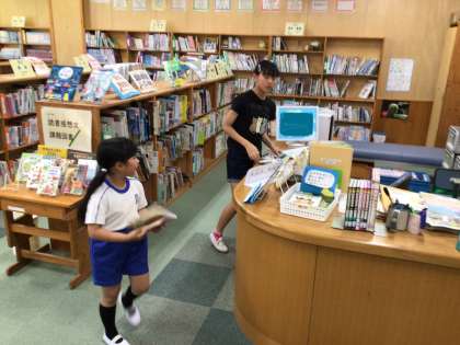 日頃から司書さんが図書館内をしっかりと整備しており、今日も、新しく購入した本に子どもたちが集まっていました。