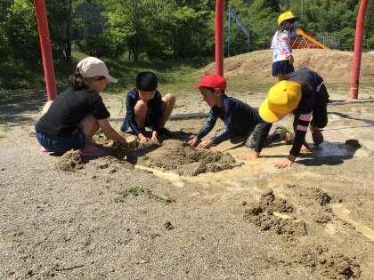 子どもたちは、思いつくままに、水路を作ったり、トンネルを作ったり、手作りの船を浮かべたり。